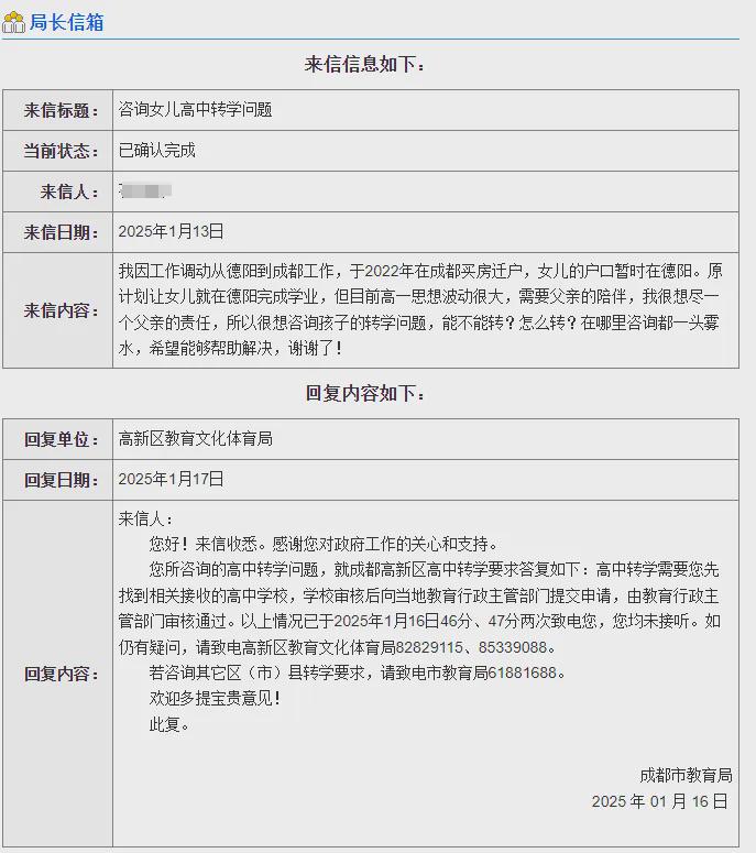 目前暂时没看到统一的政策要求,但可以参考今年1月份,成都市教育局针对高中转学咨询的回复:高中转学需要您先找到相关接收的高中学校,学校审核后向当地教育行政主管部门提交申请,由教育行政主管部门审核通过。