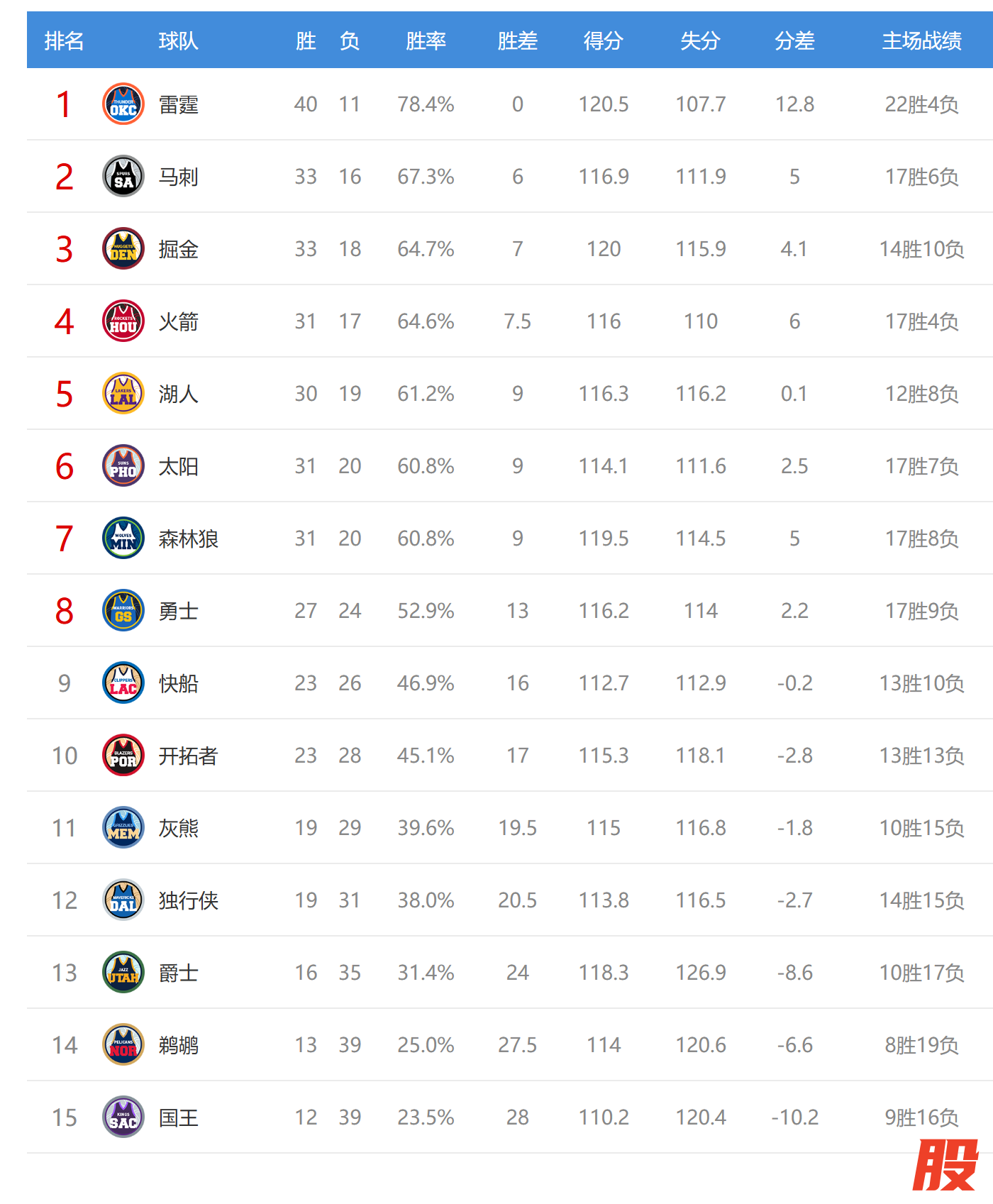 雷霆赢球后2连胜,战绩40胜11负,高居联盟第一。